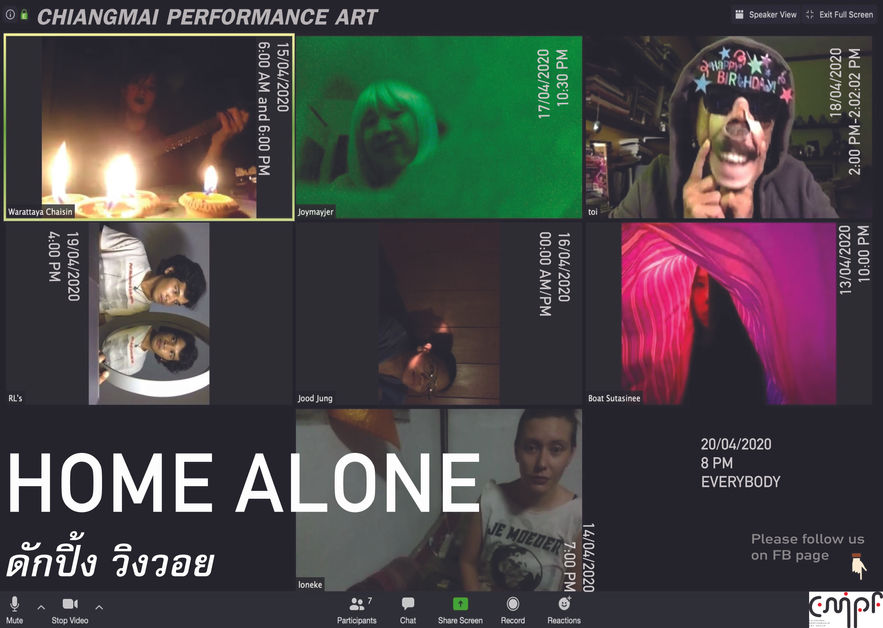 HOME ALONE (ดักปิ้ง วิงวอย) :We all feel that this is a hard time. We from the Chiang mai performance art group like to lighten your spirit up with a week of online performance art. From Monday the 13th of April we will have a live online performance each day of the week.